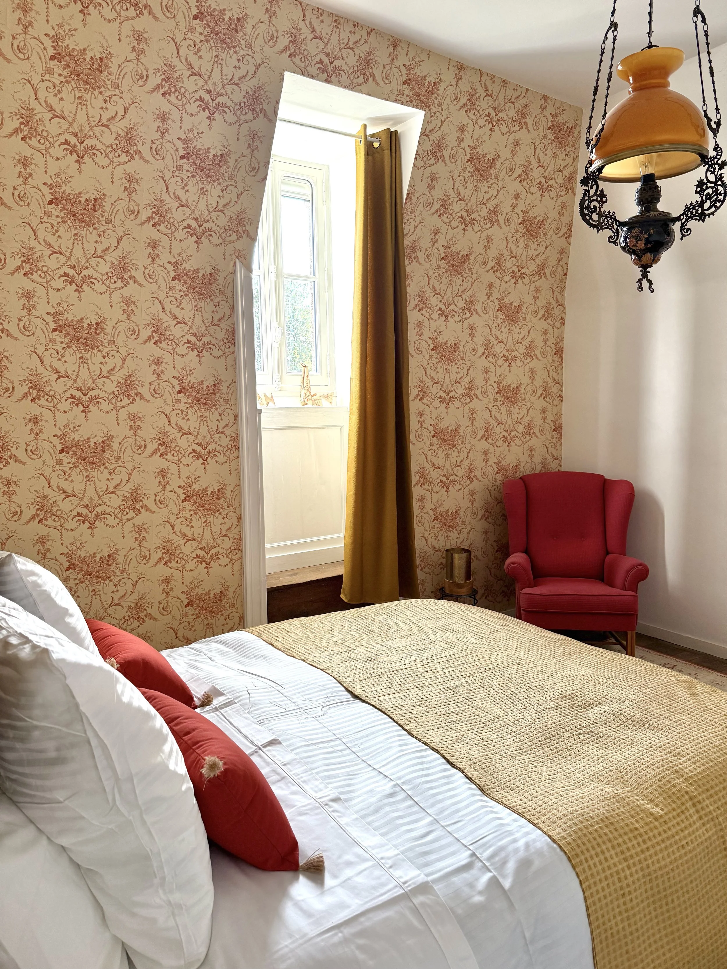 This Queen-bed en-suite room invites wonder with every detail. From the vintage floral wallpaper in poppy red and teal to the original wooden beams above, Nostalgie wraps you in beauty, history, and warmth. The floors whisper stories beneath your feet, while the round tower bath offers a peaceful pause. Gaze out over the park, the pond, and the open land beyond—and let yourself be transported.